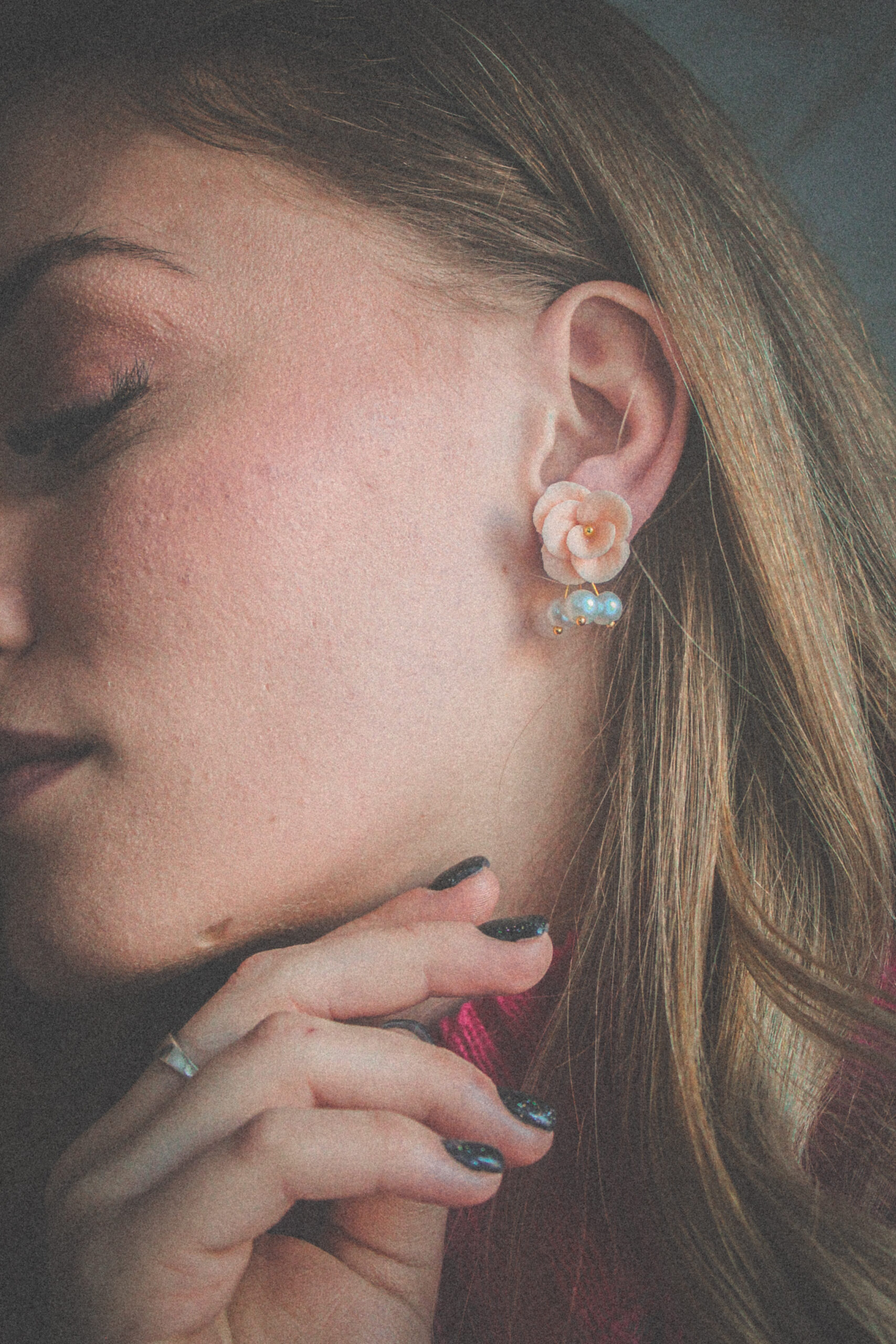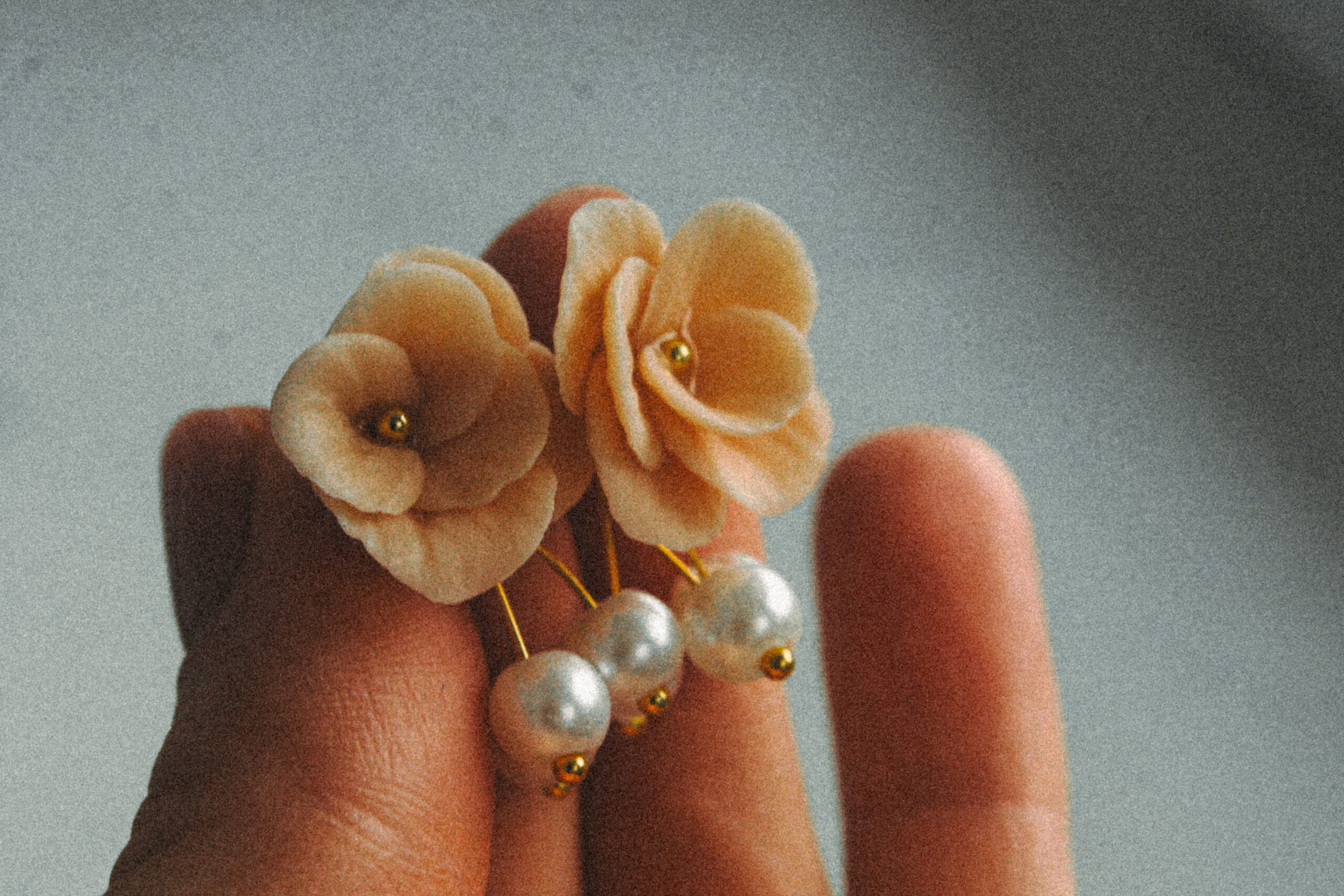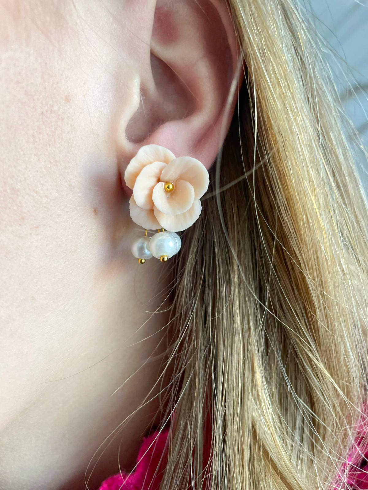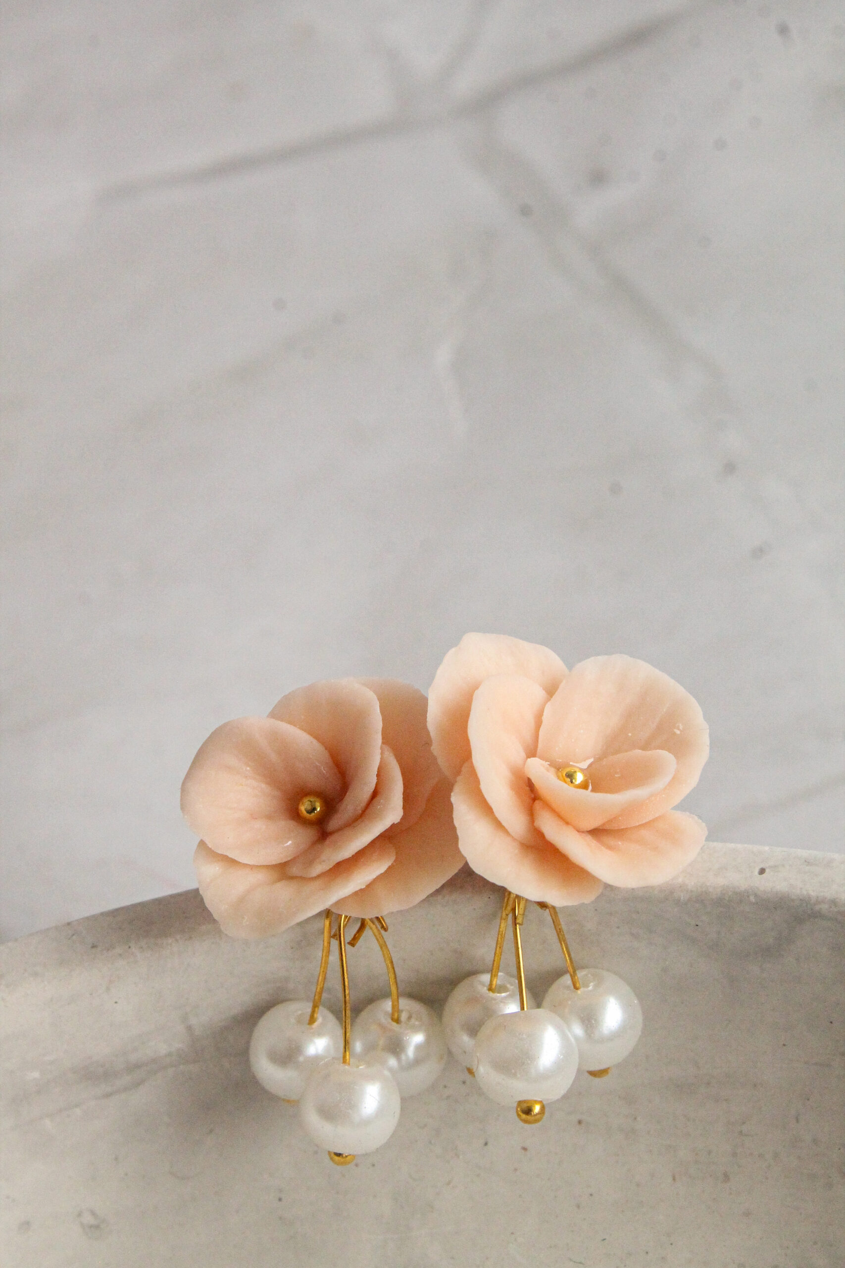 Handcrafted from polymer clay, each petal is carefully shaped to create a lifelike floral design, finished with a subtle gold detail and dainty pearl accents that gently catch the light.